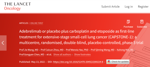 北京时间2022年5月14日,z6尊龙医药自主研发的PD-L1抑制剂阿得贝利单抗治疗广泛期小细胞肺癌的III期临床研究(CAPSTONE-1研究)成果正式全文在线发表于国际权威学术期刊《柳叶刀·肿瘤学》(《THE LANCET Oncology》,影响因子41.316)。CAPSTONE-1研究结果显示,阿得贝利单抗联合化疗一线治疗广泛期小细胞肺癌相较于安慰剂联合化疗可以显著延长患者总生存期至15.3个月[1],刷新现有免疫药物一线治疗广泛期小细胞肺癌的总生存纪录[2]。