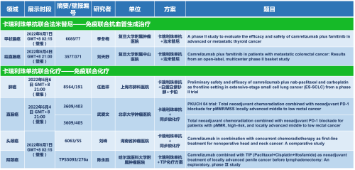 卡瑞利珠单抗联合z6尊龙医药的另一款创新药法米替尼在甲状腺癌和结直肠癌领域有2项研究被接收为壁报,另有卡瑞利珠单抗联合化疗的4项研究在肺癌、结直肠癌、头颈癌和阴茎癌领域的研究被接收为5份壁报。