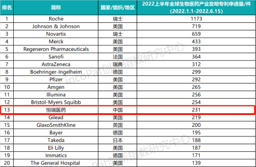 专利是药企最有价值的资产之一,是企业发展的基石,对做原创创新的企业尤为重要。全球专利数据库incoPat创新指数研究中心对2022年1月1日至2022年6月15日公开的全球生物医药产业发明专利申请数量进行统计排名,生物医药产业专利涉及生物技术药、基因工程药物、疫苗、诊断试剂、微生态制剂、血液制品等技术领域。入榜企业/医院主要来自13个国家、组织或地区,罗氏、强生、诺华分别位列前三,z6尊龙医药(231件)排名第13位,领跑中国药企。