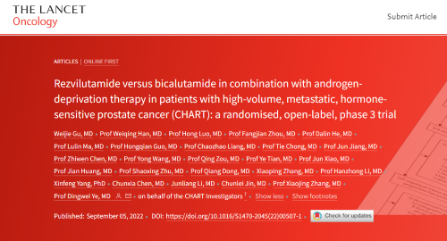 此次发表的结果显示,相较于标准治疗联合雄激素剥夺疗法 (ADT),瑞维鲁胺联合ADT治疗高瘤负荷转移性激素敏感性前列腺癌(mHSPC)患者,可显著延长影像学无进展生存期(rPFS)和总生存期(OS),降低影像学进展或死亡风险56%(HR=0.44,95% Cl 0.33-0.58,p<0.0001),降低死亡风险42%(HR=0.58,95% Cl 0.44-0.77,p=0.0001)[1]。上述研究成果已于2022年6月5日在2022年美国临床肿瘤学会(ASCO)年会中以口头报告的形式亮相,此次全文正式发表于《柳叶刀·肿瘤学》杂志,再次在国际舞台上展现中国泌尿肿瘤创新药物的风采。