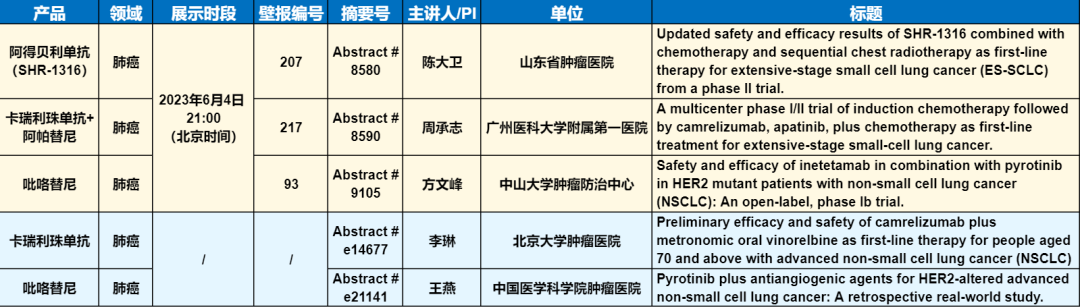 在肺癌领域,阿得贝利单抗、卡瑞利珠单抗、阿帕替尼、吡咯替尼等产品的单药或联合治疗方案相关研究共有5项研究入选(包括3项壁报展示和2项线上发表)。