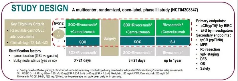 本项研究计划招募512例初始可切除的T3-4aN+M0胃癌或胃食管结合部腺癌患者,按1:1的比例随机分配到SOXRC组(SOX联合卡瑞利珠单抗联合阿帕替尼)或SOX组。根据原发灶位置(胃 vs. 胃食管结合部)和Bulky N(是 vs. 否)进行分层。患者术前分别接受3个周期的卡瑞利珠单抗+阿帕替尼+SOX或SOX,随后进行胃癌D2根治术。术后SOXRC组接受3个周期的卡瑞利珠单抗+阿帕替尼+SOX,和卡瑞利珠单抗+阿帕替尼维持治疗(卡瑞利珠单抗术前术后最多使用17个周期,阿帕替尼术前术后总治疗时长不超过一年),SOX组进行3个周期的SOX,和S-1维持治疗(总治疗时长不超过一年)。主要终点是盲态独立评审委员会(BIRC)评估的病理完全缓解(pCR)率(ypT0)和研究者评估的无事件生存期(EFS),次要终点为tpCR (ypT0N0)、主要病理缓解(MPR)、R0切除率、ypN分期、无病生存期(DFS)、OS和安全性。