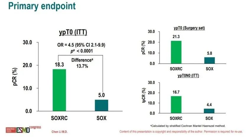 •卡瑞利珠单抗联合阿帕替尼和化疗组pCR 18.3%,显著高于化疗组的5.0%,p<0.0001。研究仍在继续,待EFS数据成熟;