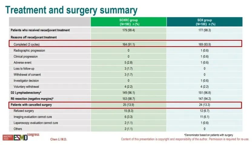 • SOXRC组新辅助完成率为91.1%,SOX组新辅助完成率为93.9%;