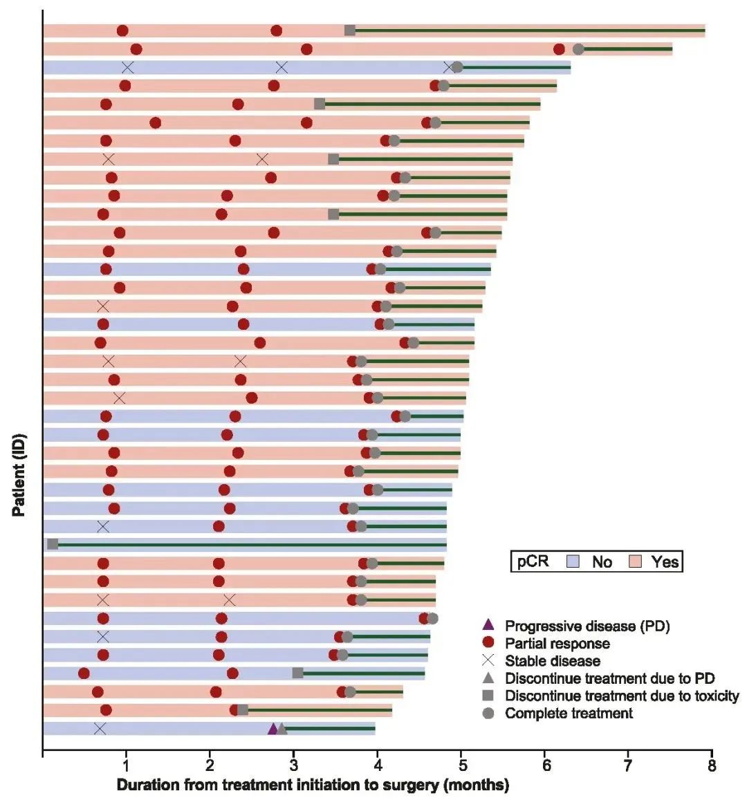 39例患者在新辅助治疗期间进行影像学评估,35例患者为部分缓解(PR),4例患者为疾病稳定(SD),ORR为89.7%(95%CI:74.8,96.7)。