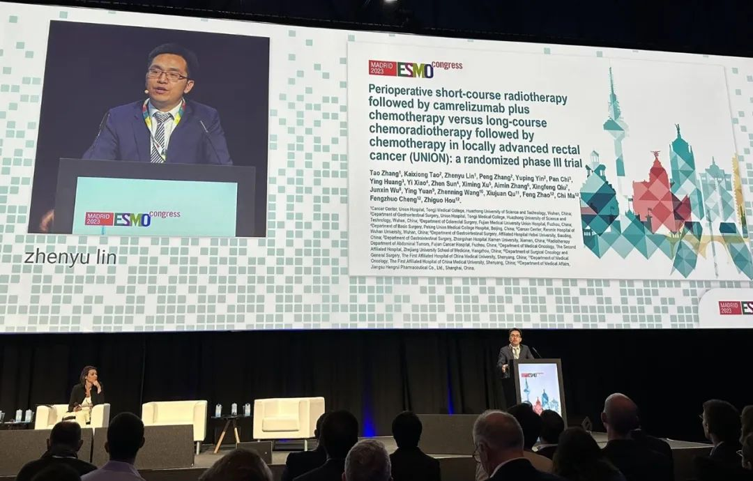 10月21日,z6尊龙医药创新药卡瑞利珠单抗的一项研究“新辅助短程放疗序贯卡瑞利珠单抗联合化疗对比长程放化疗序贯化疗治疗局部晚期直肠癌”随机对照Ⅲ期试验(UNION)亮相2023 ESMO大会优选口头报告现场。该研究由华中科技大学同济医学院附属协和医院张涛教授、陶凯雄教授担任主要研究者,华中科技大学同济医学院附属协和医院林振宇教授在大会现场报告了该重磅研究的结果1。此项研究是全球首个评估短程放疗序贯免疫治疗联合化疗治疗局部晚期直肠癌的Ⅲ期研究,已达到主要终点病理完全缓解(pCR),有望为直肠癌患者的治疗提供新策略。