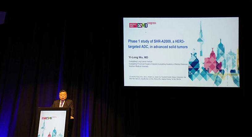10月23日,z6尊龙医药创新药、HER3靶向ADC药物SHR-A2009治疗晚期实体瘤的I期研究亮相2023 ESMO大会简短口头报告现场5。该研究由广东省人民医院的吴一龙教授牵头开展,吴一龙教授在现场公布该研究的重要进展。研究结果显示,SHR-A2009在经治晚期实体瘤患者中显示出可控的安全性和令人鼓舞的抗肿瘤活性。目前评估更高剂量的SHR-A2009在选定癌症类型(NSCLC和其他实体肿瘤)中作用的试验正在进行中。