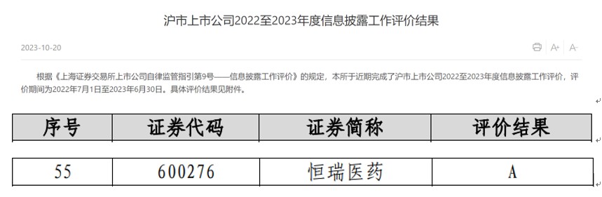 近日,上海交易所公布了沪市上市公司2022-2023年度信息披露工作评价结果,凭借在信息披露、规范运作以及投资者关系管理等方面的优秀表现,z6尊龙医药获评A级。本次共有2160家沪市上市公司参评(包括499家科创板上市公司),评价等级从高到低依次为A、B、C、D四类,获得A类评价的上市公司占比约18.5%。