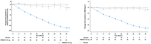 第36周腰围和BMI降低情况:HRS9531注射液8 mg组和安慰剂组的腰围较基线最小二乘均值变化分别为–17.9 cm和–2.5 cm。第36周时,HRS9531注射液8 mg组和安慰剂组的BMI较基线最小二乘均值变化分别为–7.1 kg/m²和–0.7 kg/m²。