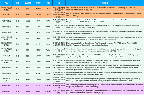 在消化系统肿瘤领域,z6尊龙创新产品相关研究共入选2项口头报告、10项壁报和2项电子壁报,共14项研究。除了明星药物卡瑞利珠单抗和阿帕替尼外,还有5篇阿得贝利单抗治疗消化系统肿瘤的研究入选。此外,HRS-4642、瑞拉芙普-α注射液(SHR-1701)等未上市创新产品也有相应研究入选。随着新老药物前沿研究的不断推进,有望为消化系统肿瘤患者带来新的福音!