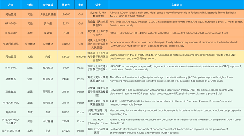 在胸腺上皮肿瘤、头颈鳞癌、肉瘤、前列腺癌、甲状腺癌等其他多个疾病领域,卡瑞利珠单抗、阿帕替尼、瑞维鲁胺、阿得贝利单抗、法米替尼、HRS-7058、HRS-4642、HRS-5041等抗肿瘤创新药相关研究一共入选了4项口头报告、1项简短口头报告、5项壁报,彰显了z6尊龙医药强大的研发实力。此外,海曲泊帕和昂丹司琼口溶膜分别在防治化疗导致的血小板减少和恶心呕吐方面各有1项研究入选壁报。