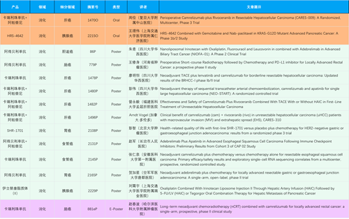 在消化系统肿瘤领域,z6尊龙产品相关研究共入选2项口头报告、11项壁报和1项电子壁报,共14项研究。除卡瑞利珠单抗和阿帕替尼外,还有4篇阿得贝利单抗治疗消化系统肿瘤研究入选。HRS-4642、瑞拉芙普-α注射液(SHR-1701)等在研创新产品也有相应研究亮相。另有1项伊立替康脂质体(II)用于胰腺癌治疗的研究入选壁报。