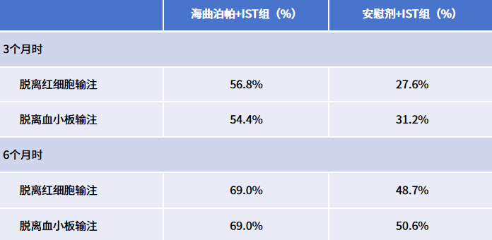 结果显示,海曲泊帕联合IST可显著提高SAA患者的血液学缓解率,6个月时,海曲泊帕组的CR率是安慰剂组的2倍以上,分别为28.1%和13.8%(P=0.0129),且海曲泊帕组的总缓解率(ORR)也高于安慰剂组,分别为63.8%和42.5%。3个月时,海曲泊帕组的CR率和ORR均优于安慰剂组(CR率:8.8% vs 5.0%;ORR:50.6% vs 25.0%)。同时,海曲泊帕联合IST可更早实现血液学缓解,首次实现血液学缓解的中位时间比安慰剂组提前54天(87天 vs 141天)。此外,在3个月和6个月时,海曲泊帕组脱离红细胞和血小板输注的患者比例均高于安慰剂组(表1)。